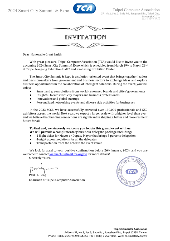 Formal invitation letter to 2024 Smart City Summit and Expo ⇩ |