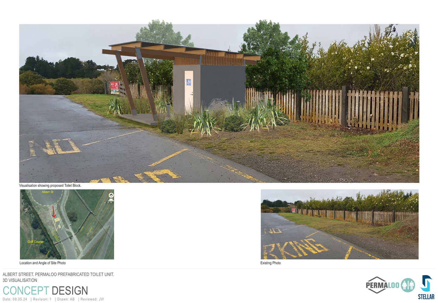 1.1 To meet public demand for a toilet option at the Albert Street River entrance, a single pan public toilet is proposed for the end of Albert Street within the road reserve.
