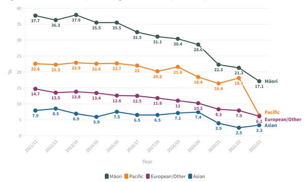 [3] Nip, J., Edwards, R., Ball, J., Hoek, J., Waa, A. (2023). Smoking Prevalence and Trends: Key Findings in the 2022/23 NZ Health Survey. Public Health Communication Centre Aotearoa. https://www.phcc.org.nz/briefing/smoking-prevalence-and-trends-key-findings-202223-nz-health-survey