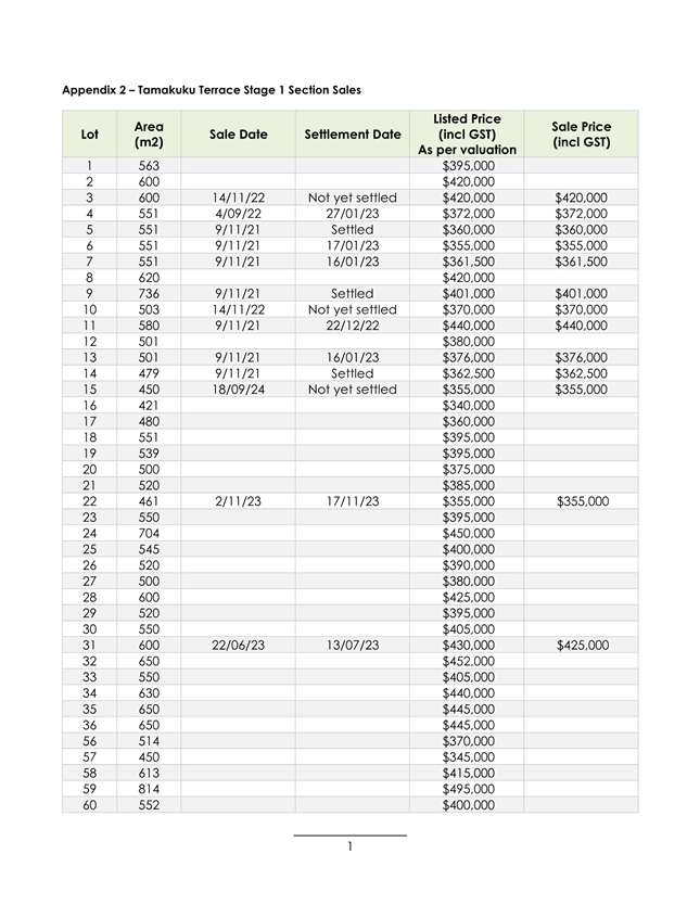 3.10 A more detailed table of the Stage 1 section sales including the section sizes, sale dates, settlement dates, and confirmed sale prices are given in Appendix 2. Note that the summary table above contains the GST-exclusive values and Appendix 2 provides GST-inclusive sale prices.