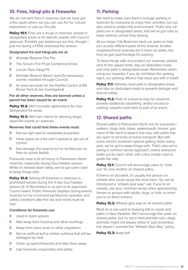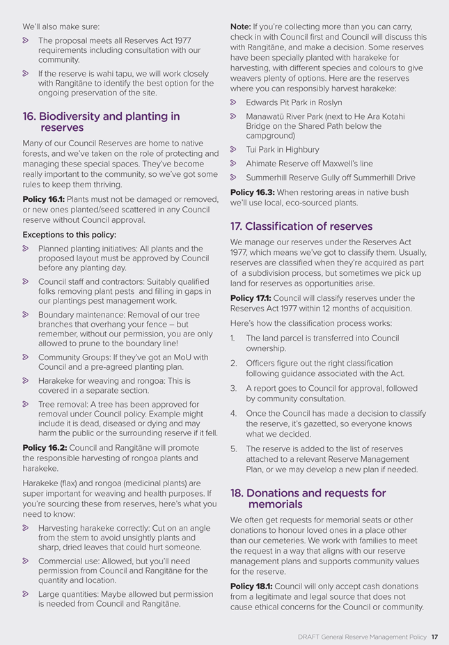 The Committee considered submissions on the Ashhurst Domain Reserve Management Plan Review together with supporting oral statements including additional tabled material. The following persons appeared before the Committee and made oral statements in support of their submissions and replied to questions from Elected Members, the additional points being: Natural Burial Manawatū (Jean Hera, Angie Crabtree and Jennie Gleeson) (65) Jean Hera and Jennie Gleeson spoke to Natural Burial Manawatū’s submission and made no additional comments. Angie Crabtree, from her personal perspective, stated that her family was looking forward to seeing natural burial options available soon. Beauchamp Funeral Home (Anthony Beauchamp) (84) Anthony Beauchamp spoke to Beauchamp Funeral Home’s submission and made no additional comments. Manawatū Estuary Management Team (Kathryn Lane) (75) Kathryn Lane spoke to the Manawatū Estuary Management Team’s submission and made the following additional comments: · Particular support to policy 3, especially policies 3.4 and 3.5. Daniel Sproull (66) Daniel Sproull spoke to his submission and made the following additional comments: · There used to be a water spring at the proposed natural burial site which fed the wetland. The area is not ideal for that purpose. |