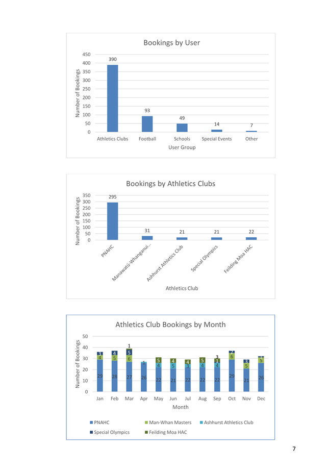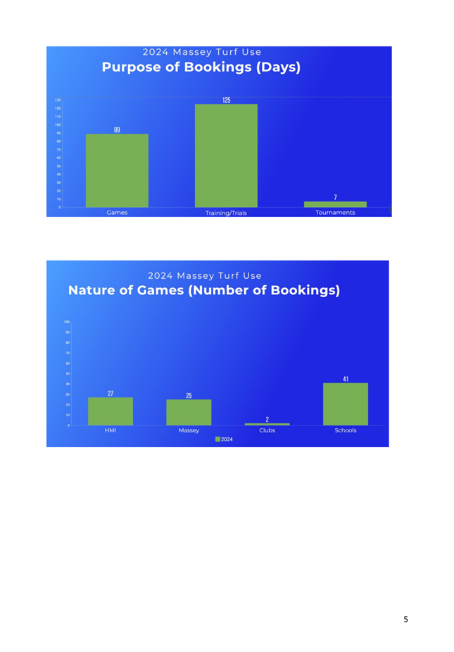 · 125 bookings for trainings and trials and 89 bookings for games spread through schools (41), Hockey Manawatu and clubs (29) and Massey University (25) uses.