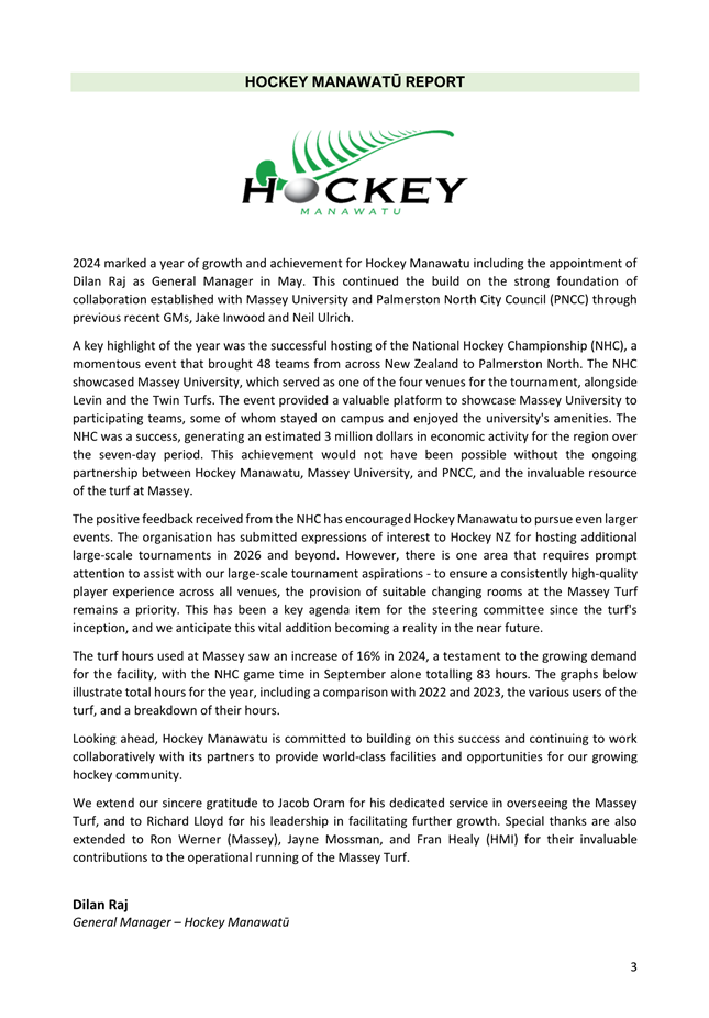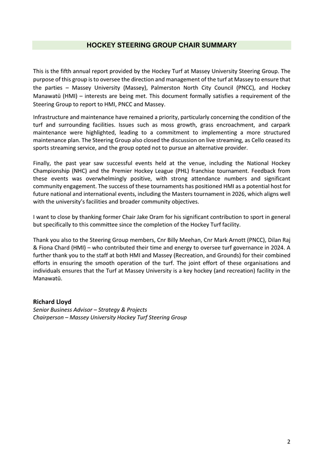 This memorandum presents the Annual Report for 2024 for the Hockey Turf at Massey University.