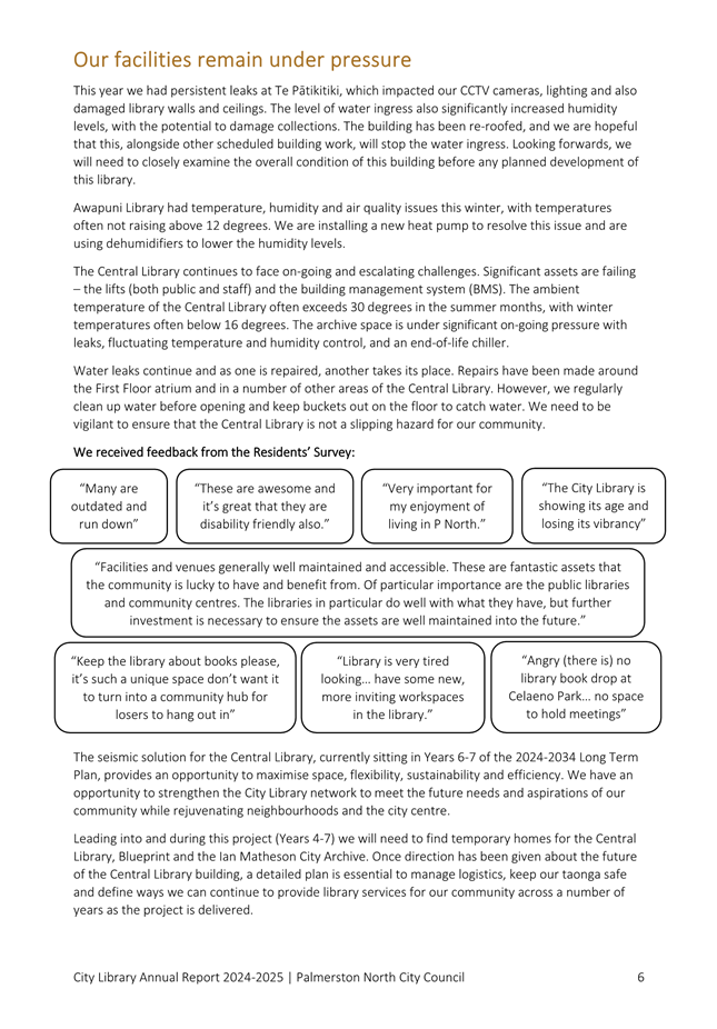 15.12 This year there were persistent leaks at Te Pātikitiki, which impacted the CCTV cameras, lighting and also damaged walls and ceilings. The level of water ingress also significantly increased humidity levels, with the potential to damage collections. The building has recently been re-roofed, and this new roof, alongside other scheduled building work, will stop water ingress. Looking forwards, we need to closely examine the overall condition of this building before undertaking any planned development of this library.