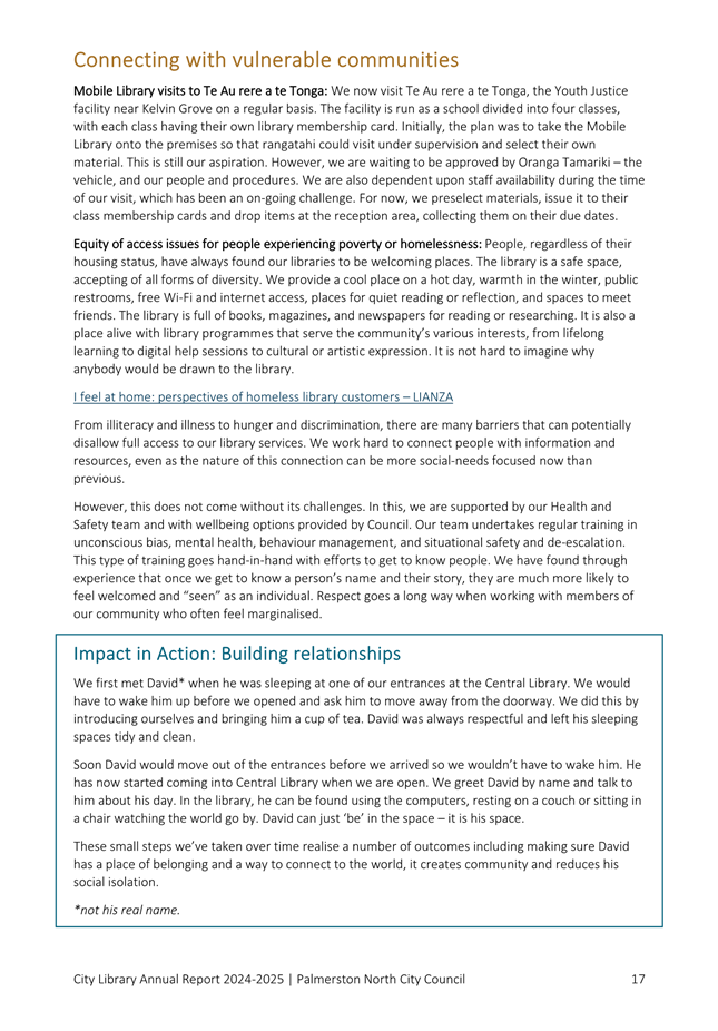 16.1 That the next annual report on library services delivered by the City Library be provided for information at the end of 2025/2026.