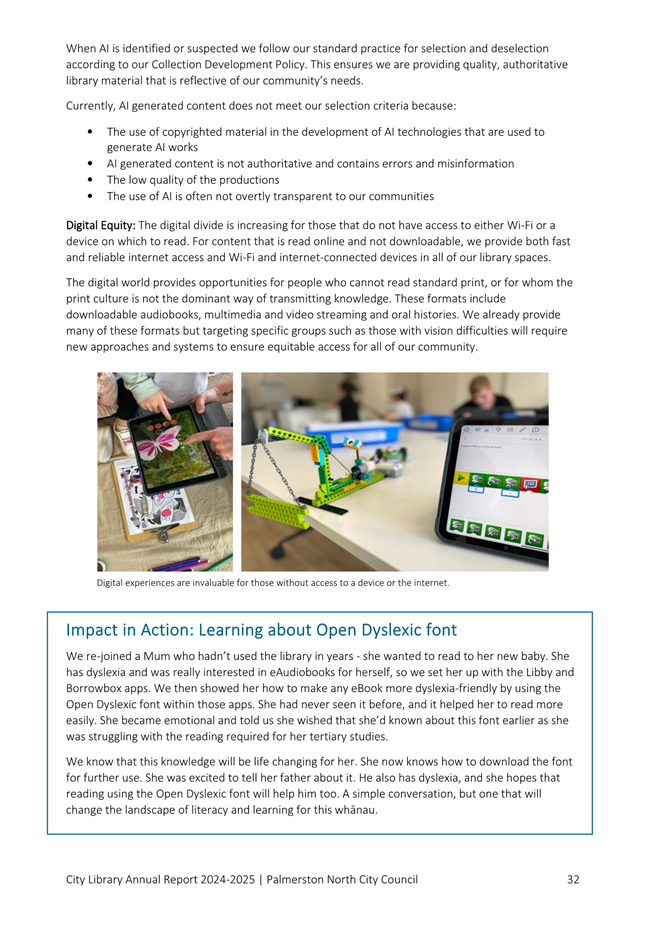 12.6 Artificial Intelligence (AI) poses both opportunities and challenges for public libraries. AI has the potential to make workstreams more responsive and efficient, but it also poses ethical, quality, transparency and copyright challenges for libraries and the wider creative sector. Libraries are seeing increasing amounts of AI generated content in library material marketplaces and Content Development and/or Collection policies are needing to be updated to manage this form of rapidly evolving content.