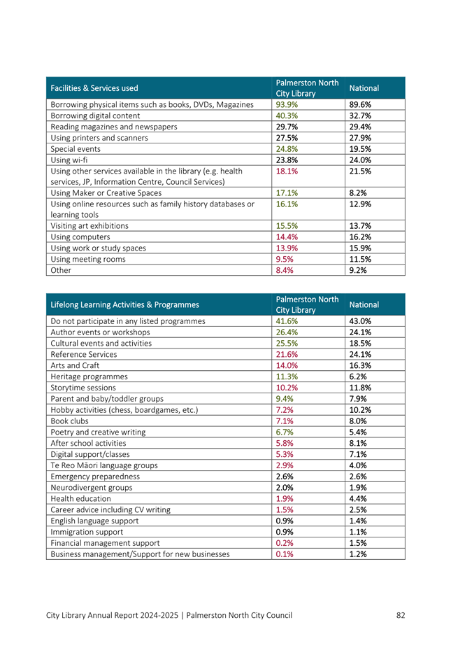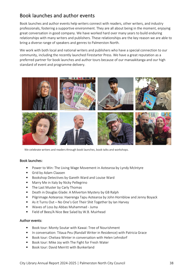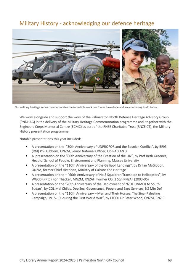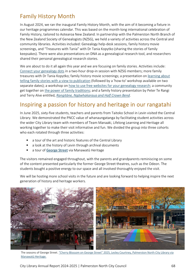 9.6 Family History Month: In August 2024, we ran the inaugural Family History Month, with the aim of it becoming a fixture in our heritage programmes calendar. Based on the month-long international celebration of Family History, we tailored our programme to Aotearoa New Zealand. In partnership with the Palmerston North Branch of the New Zealand Society of Genealogists (NZSG), we held a variety of activities across the Central and community libraries. Activities included: Genealogy help-desk sessions, family history movie screenings, and “Treasures with Tania” with Dr Tania Kopytko (sharing the stories of family keepsakes). There were also presentations on DNA as a genealogical research tool, and researchers shared their personal genealogical research stories.