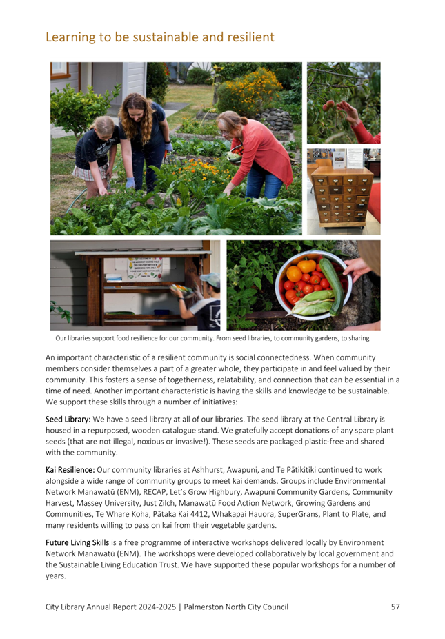 10.1 An important characteristic of a resilient community is social connectedness and having the skills and knowledge to be sustainable. We support these skills through a number of initiatives including the Palmy Crop swap, kai resilience and sustainability workshops delivered by Environment Network Manawatū (ENM).