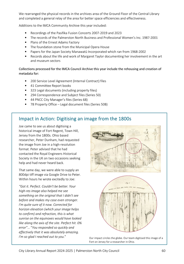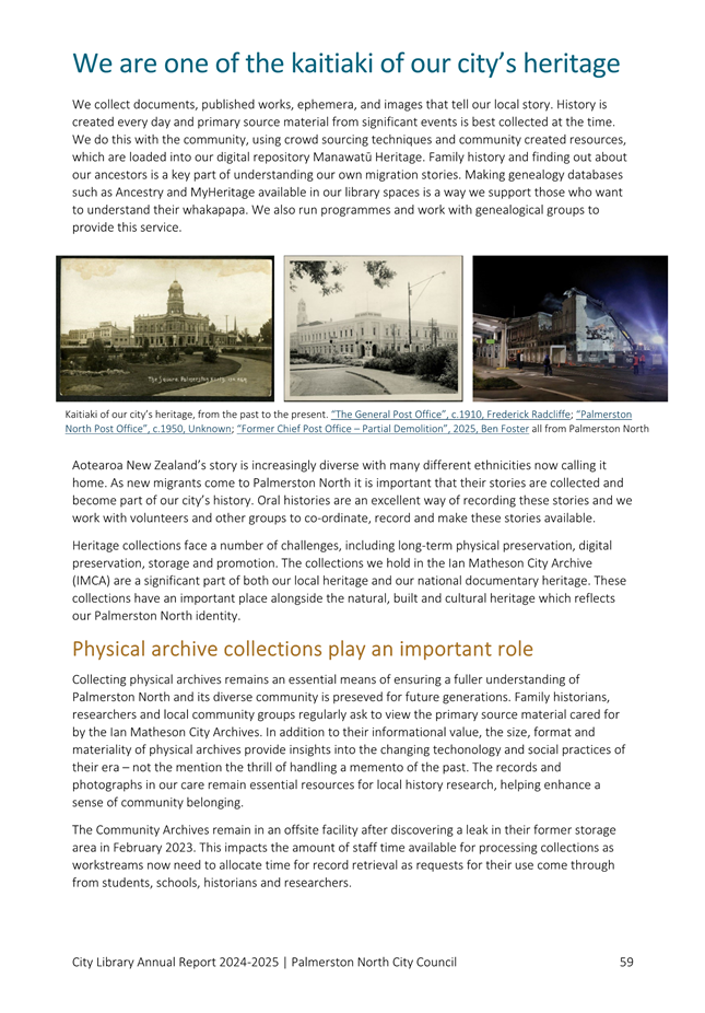 9.2 Archival and Heritage collections: The collections held in the Ian Matheson City Archive (IMCA) are a significant part of both our local heritage and the national documentary heritage of New Zealand. These collections have an important place alongside the natural, built and cultural heritage which reflects our Palmerston North identity.