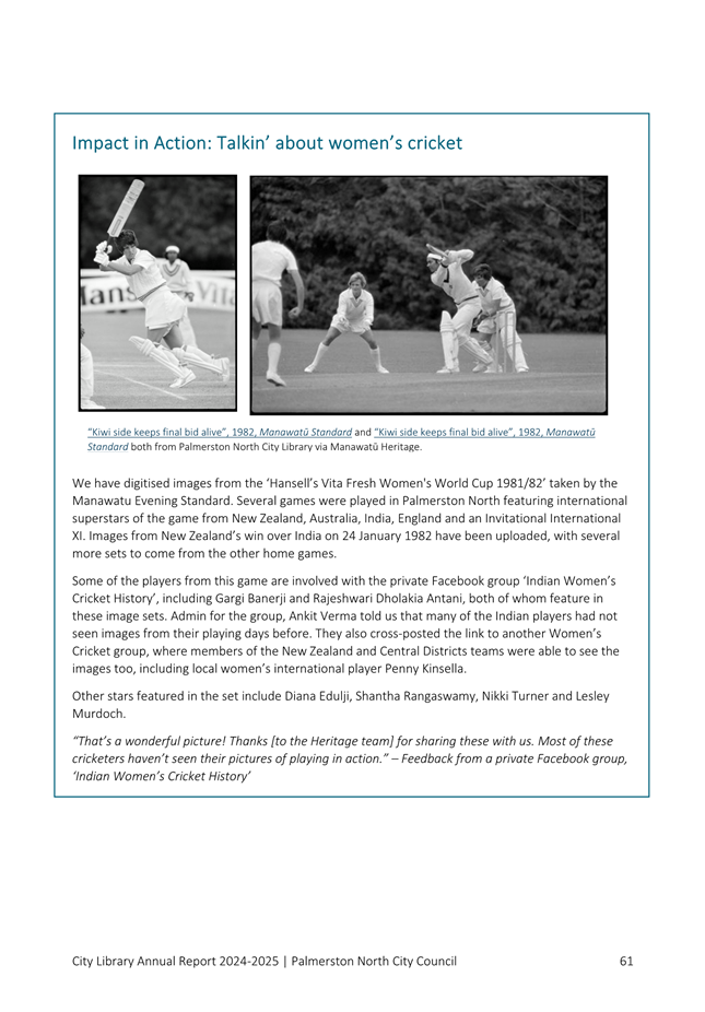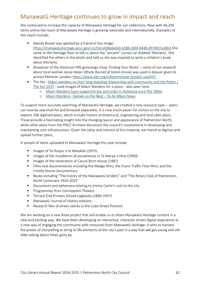 9.3 Manawatū Heritage: We continued to increase the capacity of Manawatū Heritage for our collections. Now with 46,200 items online the reach of Manawatū Heritage is growing nationally and internationally.