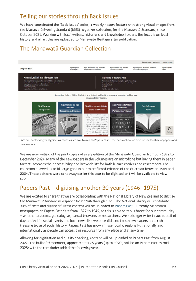 9.9 The Manawatū Guardian collection: The City Library is now kaitiaki of the print copies of every edition of the Manawatū Guardian from July 1972 to December 2024. Many of the newspapers in the volumes are on microfiche but having them in paper format increases their accessibility and browsability for both leisure readers and researchers. The collection allowed us to fill large gaps in our microfilmed editions of the Guardian between 1985 and 2004. These editions were sent away earlier this year to be digitised and will be available to view soon.