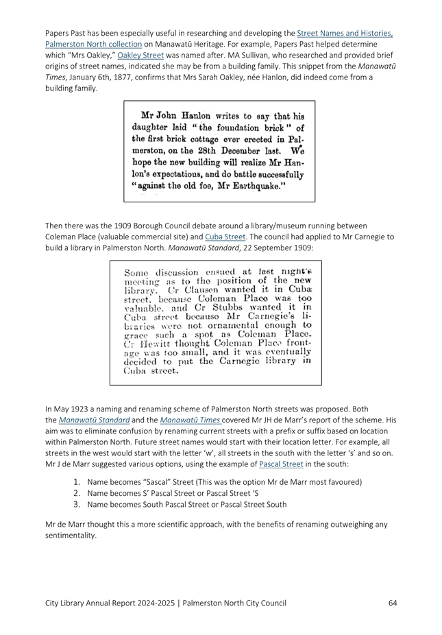 9.10 Papers Past: We are collaborating with the National Library of New Zealand to digitise the Manawatū Standard newspaper from 1946 through 1975. The National Library will contribute 30% of costs and digitised fulltext content will be uploaded to the Papers Past website. Currently Manawatū newspapers on Papers Past date from 1877 to 1945, so this is an enormous boost for our community - whether students, genealogists, casual browsers or researchers.