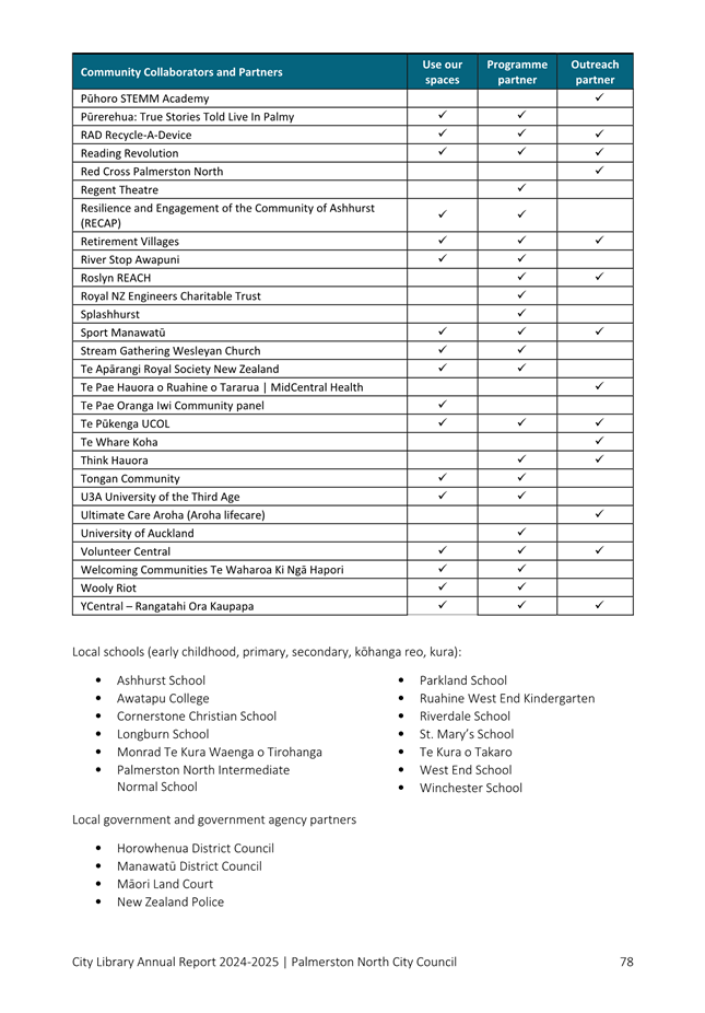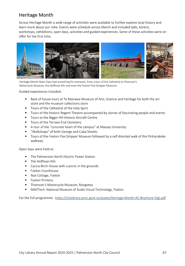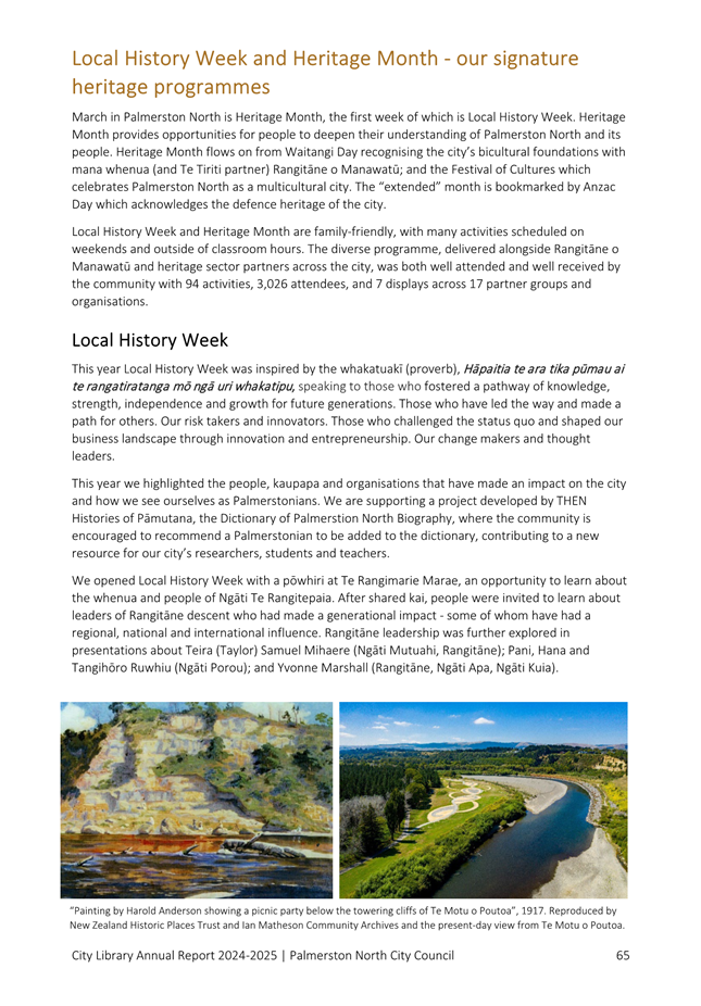 9.8 Local History Week and Heritage Month: For the third year, Local History Week was held in March and led into Heritage Month. We aim to be family-friendly, with many activities scheduled on weekends and outside of classroom hours. The diverse programme, delivered alongside Rangitāne o Manawatū and heritage sector partners across the city, was both well attended and well received by the community with 94 activities, 3,026 attendees, and 7 displays across 17 partner groups and organisations.