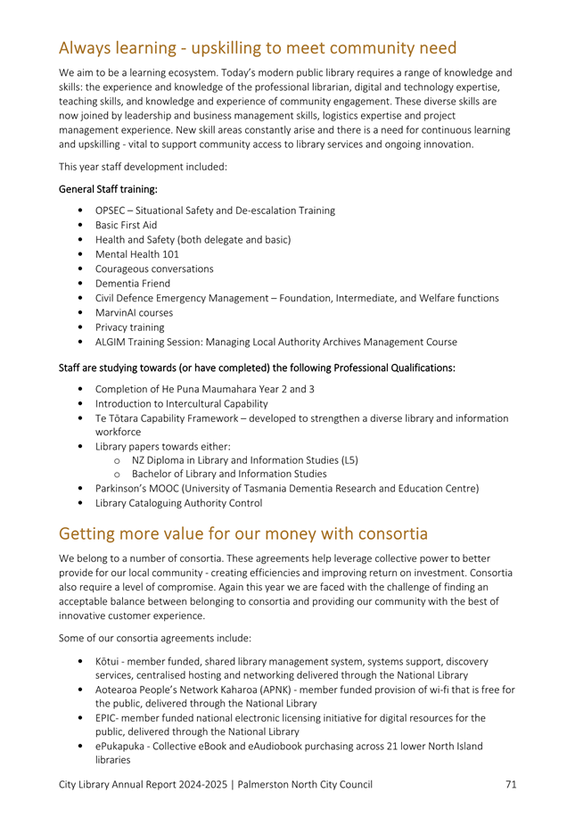13.5 Retirements, retaining knowledge and training new staff: The City Library is facing a generational shift requiring succession planning as members of a long-serving and highly skilled workforce head into retirement. This year in 2025 we will farewell four long-serving team members with over 100 years of library experience between them. We are working hard to grow and develop our current workforce to gain the experience and skills required to help ease this transition.
