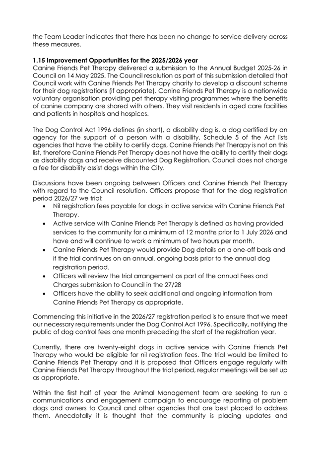 1.6 A trial will be conducted during the 2026/27 financial year with Canine Friends Pet Therapy Charity post their submission at the Annual Budget deliberation, where they will receive free registration for dogs in their agency that have been working for more than 1 year and conduct at least 2 hours work per month. The current total would be 28 dogs.