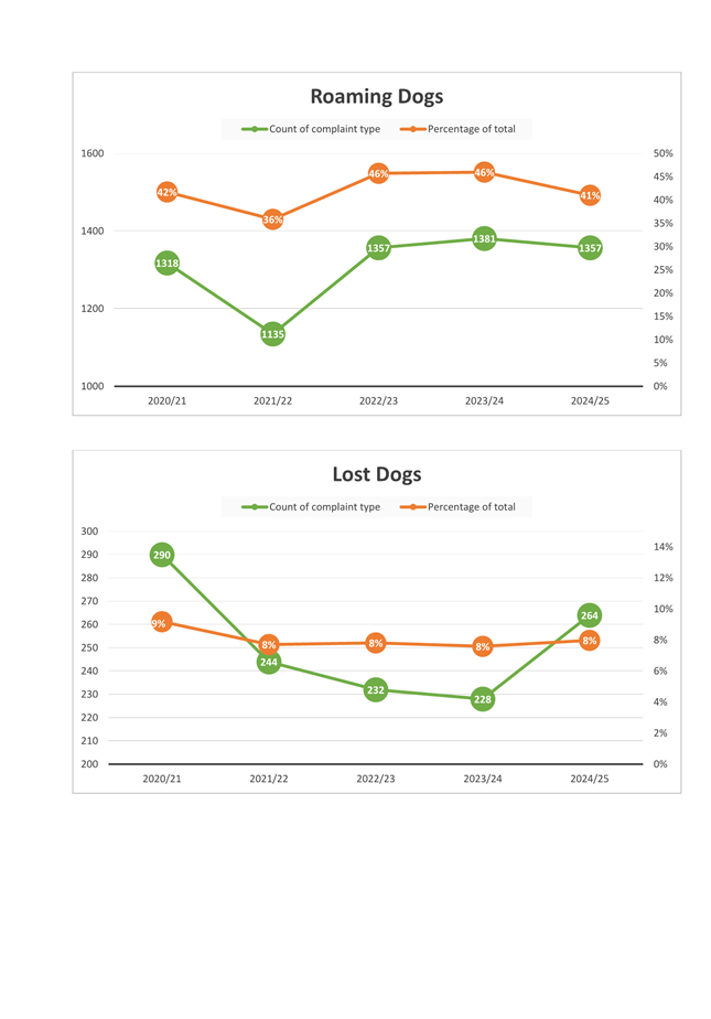 · The number of complaints increased by 9.98% to 3,306 with the most significant being roaming and roaming secured dogs, accounting for 45.9% of complaints. Barking dogs were the second most common complaint, accounting for 25.7% of complaints.